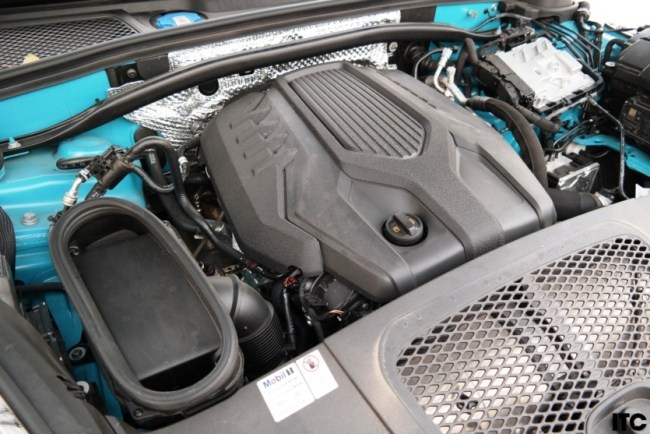 Якщо розглядати саме тестовий автомобіль Porsche Macan, то він був оснащений бензиновим 4-циліндровим 2-літровим мотором потужністю 265 к.с. (проти 245-252 к.с. на версіях до оновлення). До речі, зверніть увагу на рішення з каналом подачі повітря. Спочатку повітря заходить через решітку радіатора, далі проходить через порожнину капота - й нарешті вже потрапляє до повітрозбірника двигуна. На меншому 4-циліндровому моторі такий канал один, на більших 6-циліндрових моторах - вже два. Це рішення дозволяє встановити двигун нижче (важливо для керованості) та, одночасно, зробити пружний капот для безпеки пішоходів.